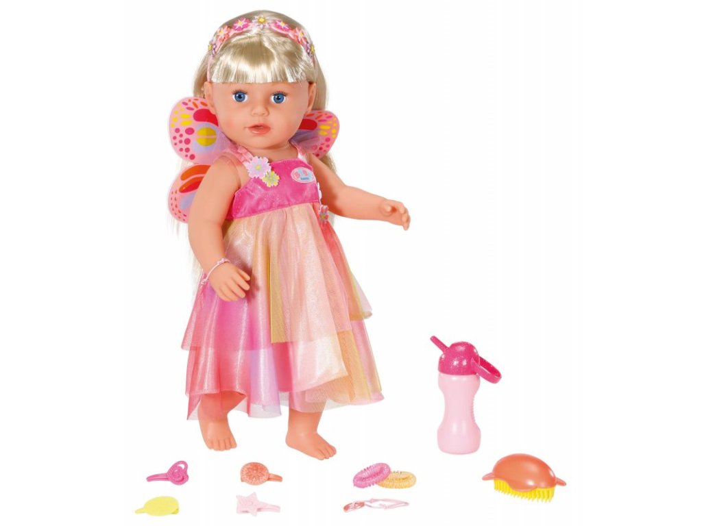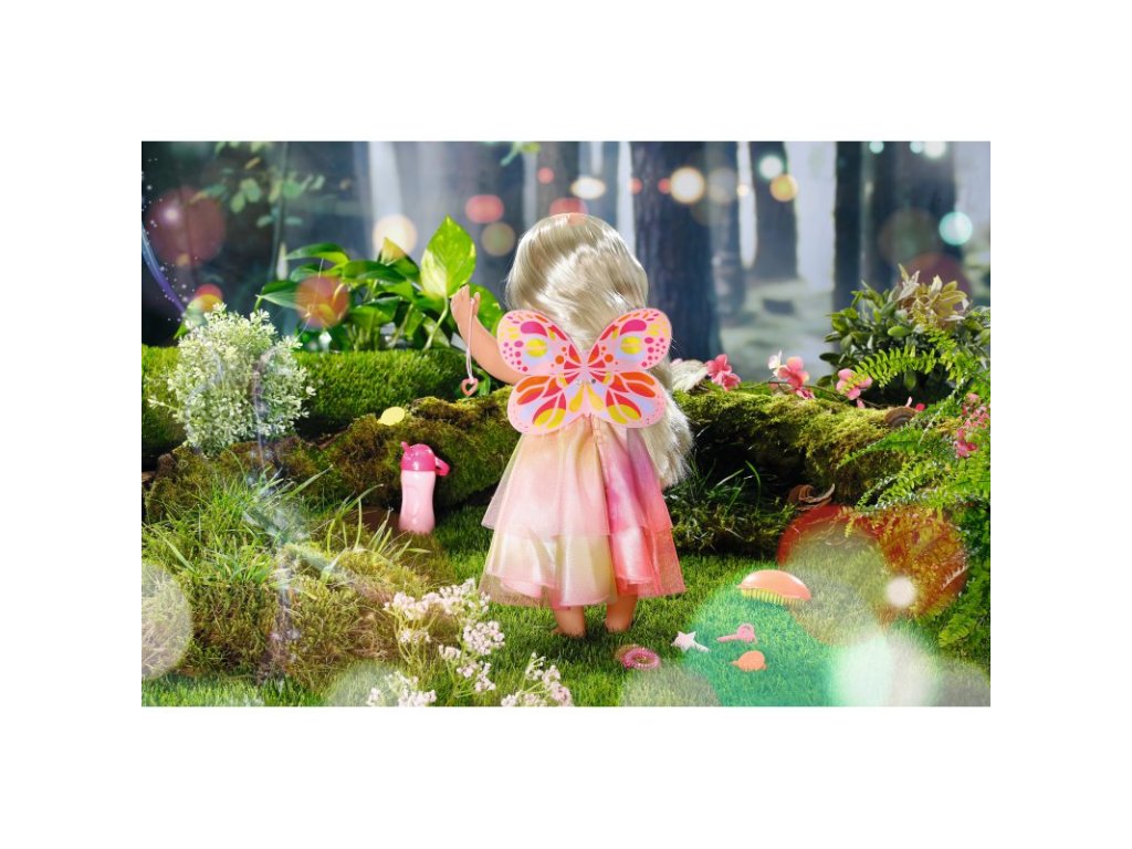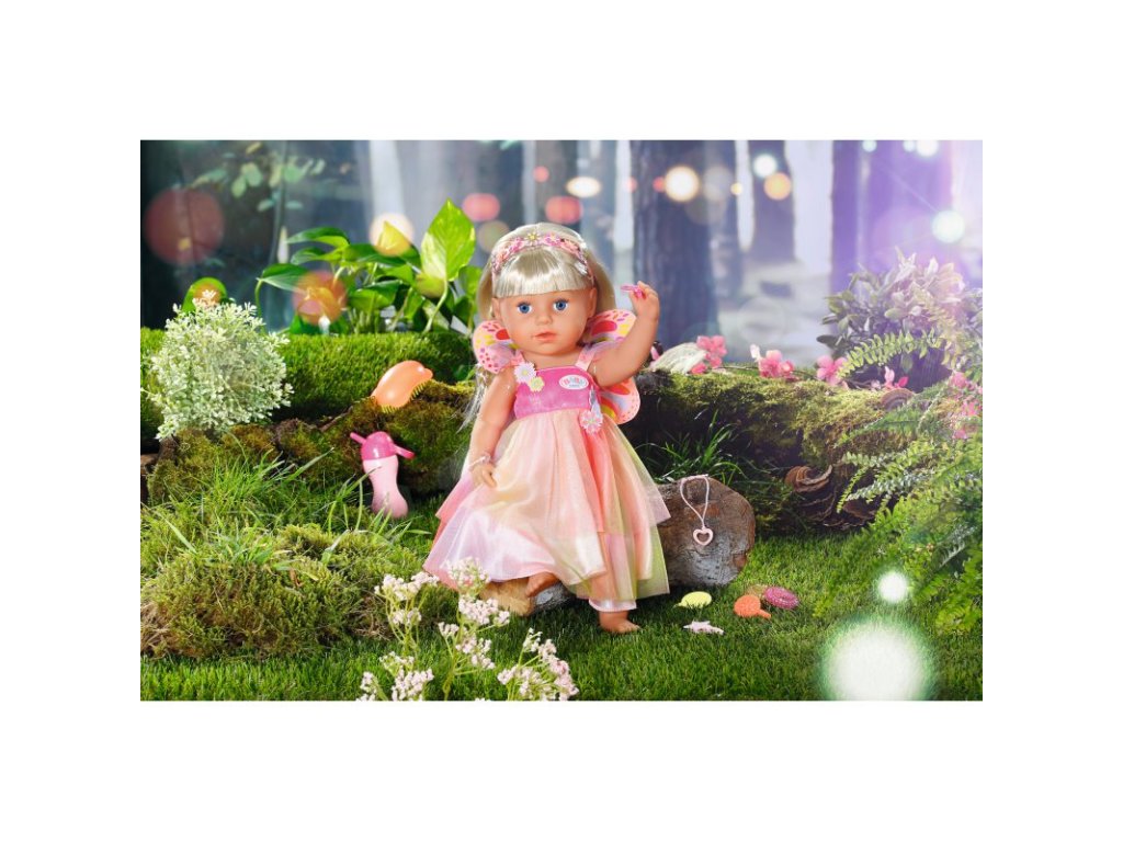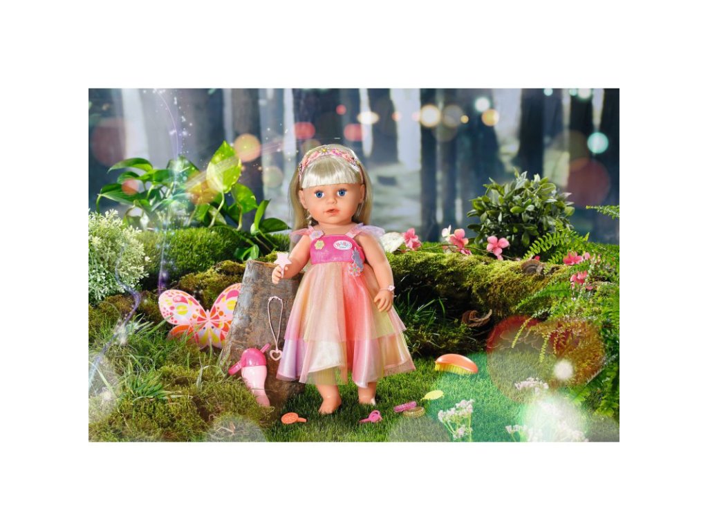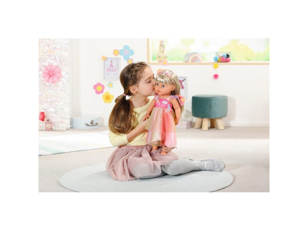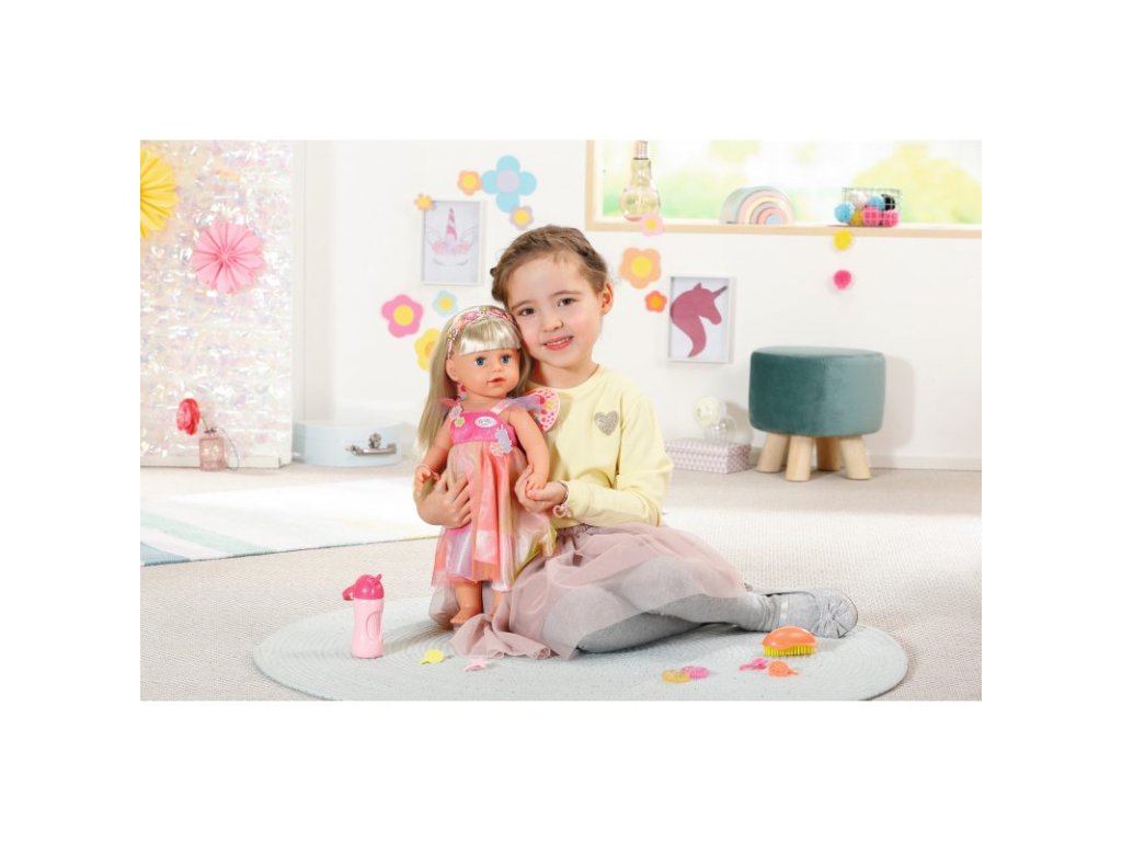 Jednorožci jsou zvláštní – stejně jako sestry. Panenka - sestřička v oblečku kouzelného jednorožce je pro BABY born právě taková okouzlující osoba. Vypadá jako drobná elfka, má na sobě tylové šaty duhové barvy s brokátovým topem a volány na ramenou. Oděv krásně dotváří ozdoby v podobě květinových záplat a jednorožce. Třpytivá křídla dodávají ještě více kouzla a pohádkový vzhled. Dlouhé blond vlasy lze štětcem, prameny a sponkami báječně upravit mnoha způsoby. Účes lze dodatečně dozdobit čelenkou s připnutými květy. Sestřička je o něco starší než Baby born, ale má stejnou výšku, takže oblečky z kolekce Baby born oběma panenkám skvěle padnou. Navíc sada obsahuje lahvičku na vodu pro panenku a 2 náramky - pro holčičku a panenku.