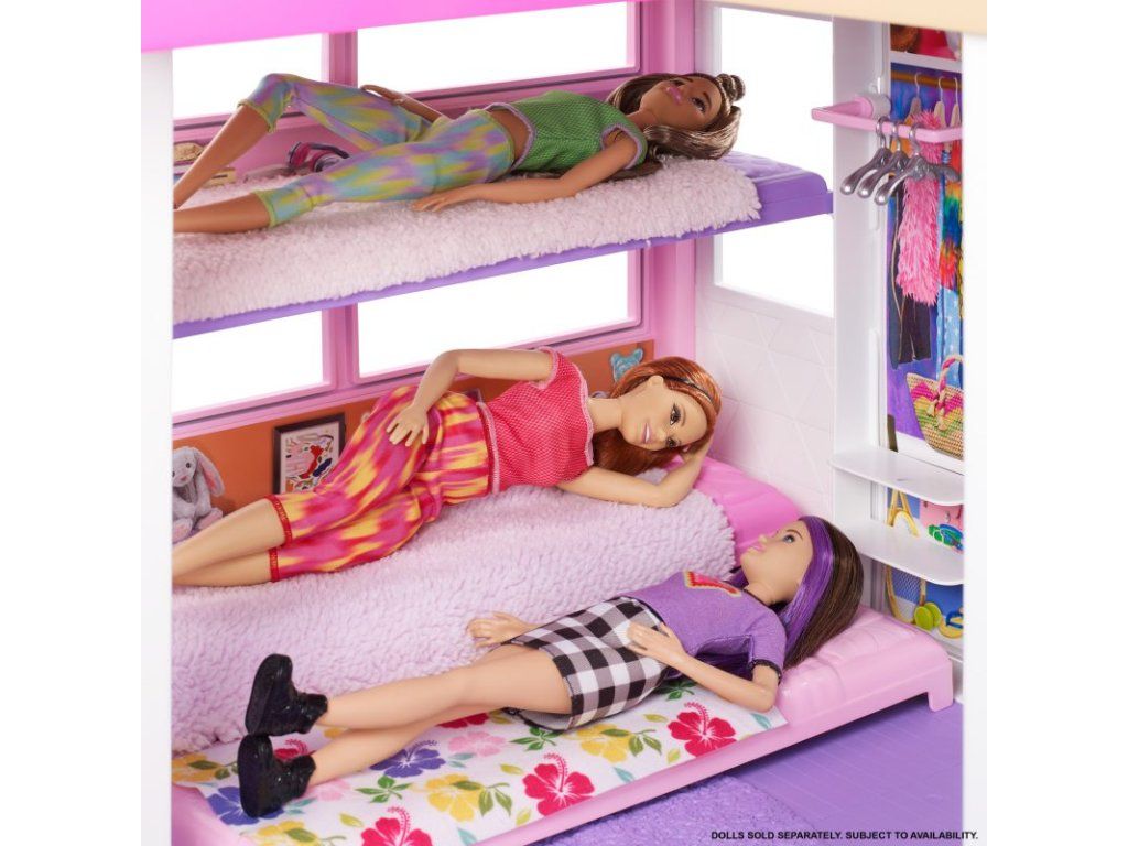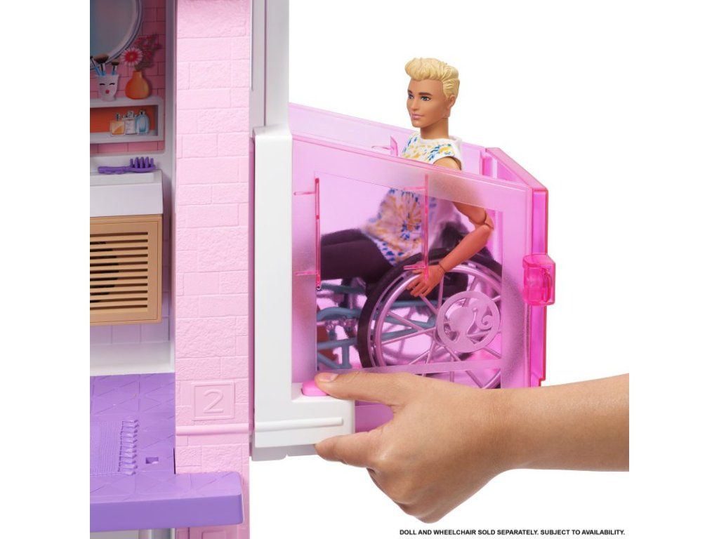 Když otevřete dveře domečku Barbie Dreamhouse, objevíte nekonečné možnosti zábavy. Tento domeček pro panenky je cca 108 cm vysoký a 102 cm široký a díky svým 3 úrovním a 10 hracím plochám (uvnitř i venku) vybízí ke hře ze všech stran. Přizpůsobte si prostor svému stylu: „trávník“ a bazén lze různě umístit, skluzavku připevnit na čtyři místa. Jakmile budete mít svou výzdobu připravenou, vytvořte jedinečnou zábavnou atmosféru se třemi melodiemi, několika zvukovými efekty a světly. Nechte se okouzlit nábytkem s transformační funkcí: gril se promění ve sladký bufet, rekreační oblast se promění v hřiště pro domácí mazlíčky a ze zdi se vysune patrová postel. Vymýšlejte různé příběhy, od každodenních domácích úkolů až po jedinečné večírky, k dispozici máte kuchyň, obývací pokoj, jídelnu, ložnici, koupelnu, bazén, balkon, taneční místnost a další. Nechte Barbie® a její přátele jezdit výtahem nahoru a dolů, naplňte bazén vodou ke koupeli, opalujte se na terase 3. patra a hrajte si se svými mazlíčky v bazénu pro domácí mazlíčky se skluzavkou. Objevte více než 75 doplňků! Všechny mají autentické detaily, díky nimž je hraní s Barbie ještě realističtější. Díky fantastickým možnostem přizpůsobení a velkému množství funkcí si děti ve věku 3 a více let zamilují zábavu s Barbie Dreamhouse Deluxe. Panenky, auto a invalidní vozík nejsou součástí dodávky. Barvy a dekorace se mohou lišit.