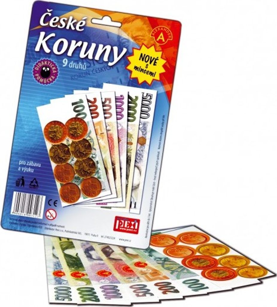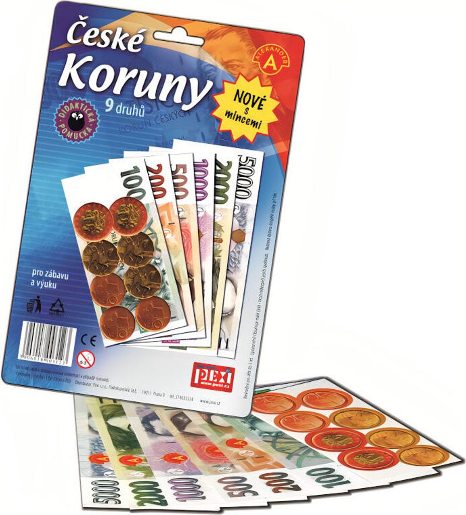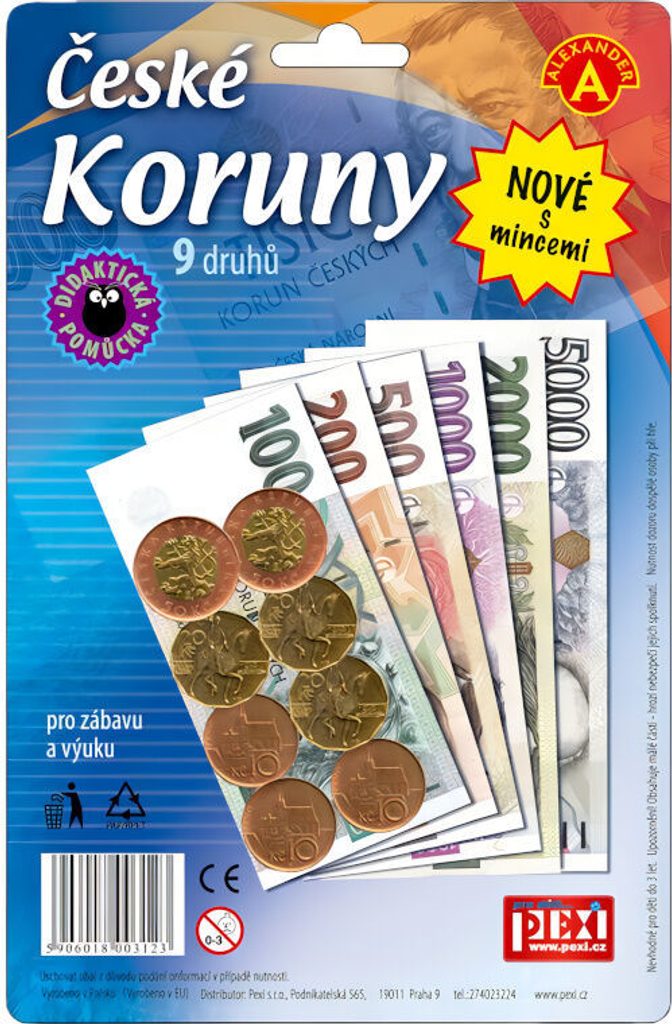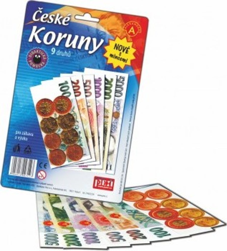 Vhodné k různým dětským hrám a jako naučná pomůcka. Seznam se s pěnězi, kterými se platí v České republice a nikdo tě už neošidí. Poslouží nejen jako doplněk k různým hrám na nákupy, ale také k seznámení malých dětí s hodnotou peněz nebo pro školní výuku. 6 druhů velkých a sytě barevných českých bankovek a k tomu ještě mince 10, 20 a 50 Kč. 149.340,-Kč v jednom balíčku!