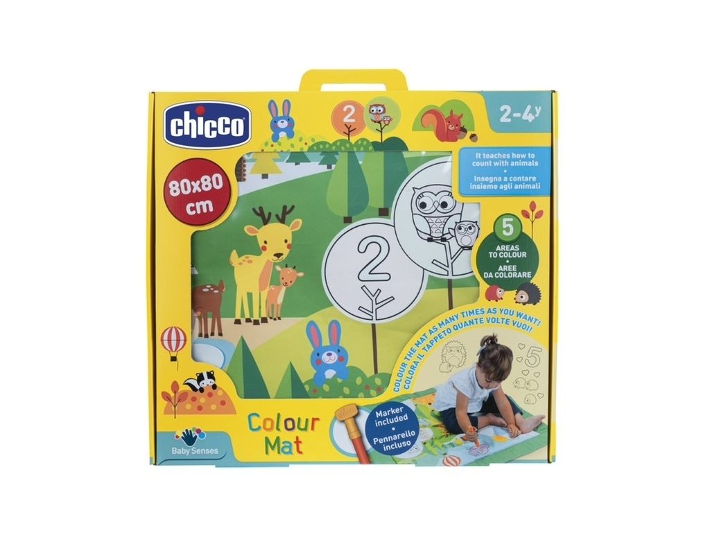 Baby Senses je řada barevných, poutavých, empatických hraček, které odkazují na předměty, které milují ti nejmenší. Každý okamžik dne a každý kontext je pro děti příležitostí objevovat svět kolem sebe a zlepšovat své dovednosti samy nebo ve společnosti dospělých. Hračky stimulují rozvoj smyslů pomocí cvičení na zlepšení paměti a koncentrace. Hračky pomáhají rodičům uspokojit přirozené touhy jejich dětí po okolním světě.Barevná podložka je velká, na dotek mimořádně příjemná podložka k lenošení a vybarvování, která učí první čísla a prvky přírody, zvířat a jejich bydliště. Opakovaně použitelný magický vodní značkovač učiní uměleckou zábavu nekonečnou! Po naplnění fixu vodou, jakmile se jeho hrot dotkne jedné z pěti bílých ploch podložky, magicky se objeví barvy na obrázcích. Když voda zaschne, barva zmizí a rohož je připravena k přebarvení.