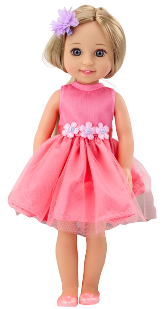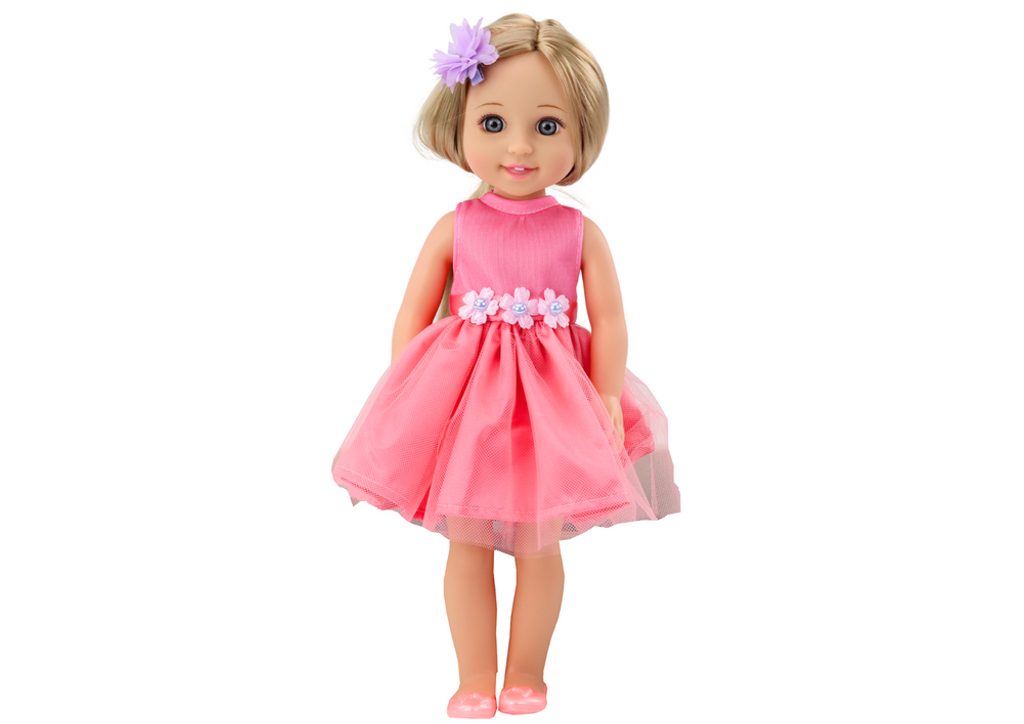 Elegantní panenka, která svým šarmem a krásným vzhledem potěší každou holčičku. Tato rozkošná panenka je dokonalým společníkem na hraní, který vás inspiruje k vytváření bezpočtu příběhů a scénářů. Panenka má dlouhé blonďaté vlásky, které se dají různě upravovat a sada obsahuje kartáč na česání a úpravu vlásků. Vlásky navíc zdobí okouzlující vlásenka, která dodává panence jedinečné kouzlo. Má na sobě krásné růžové šaty, zdobené růžovými květy a stříbrnými doplňky. Šaty jsou elegantní a stylové, vhodné pro každou příležitost. Panenka má na sobě růžové botičky, které dokonale ladí s jejími šatičkami. Má jemný make-up, který zdůrazňuje její elegantní vzhled a pečlivě namalované oči a rty, které jejímu vzhledu dodávají na výraznosti a šarmu. Panenka má pohyblivé ruce, nohy a hlavu, což umožňuje její umístění do různých pozic a dodává hře na realističnosti. Kombinace růžových šatiček s bílými puntíky se zlatými doplňky a stylovým make-upem působí panenku velmi elegantně a poutavě.Panenka je vyrobena z vysoce kvalitních materiálů, což zajišťuje její odolnost a bezpečnost při hře. Panenka díky svým pohyblivým částem a krásnému vzhledu inspiruje děti ke kreativní hře, rozvíjení jejich fantazie a sociálních dovedností.