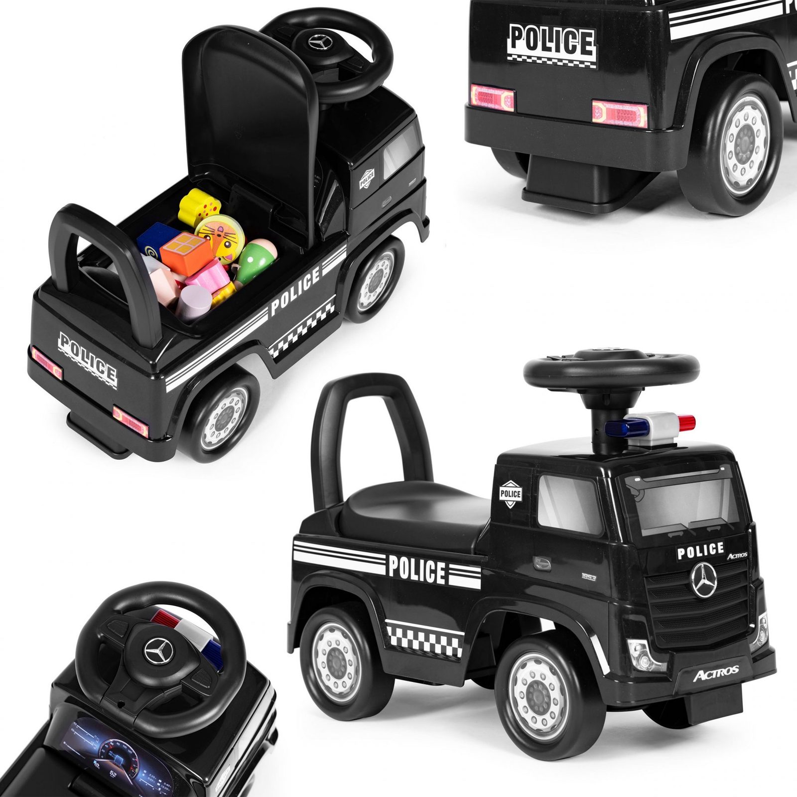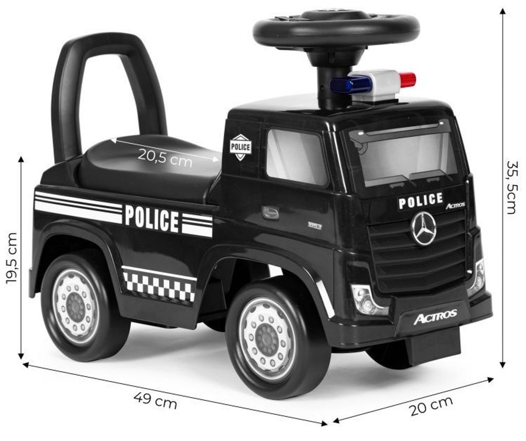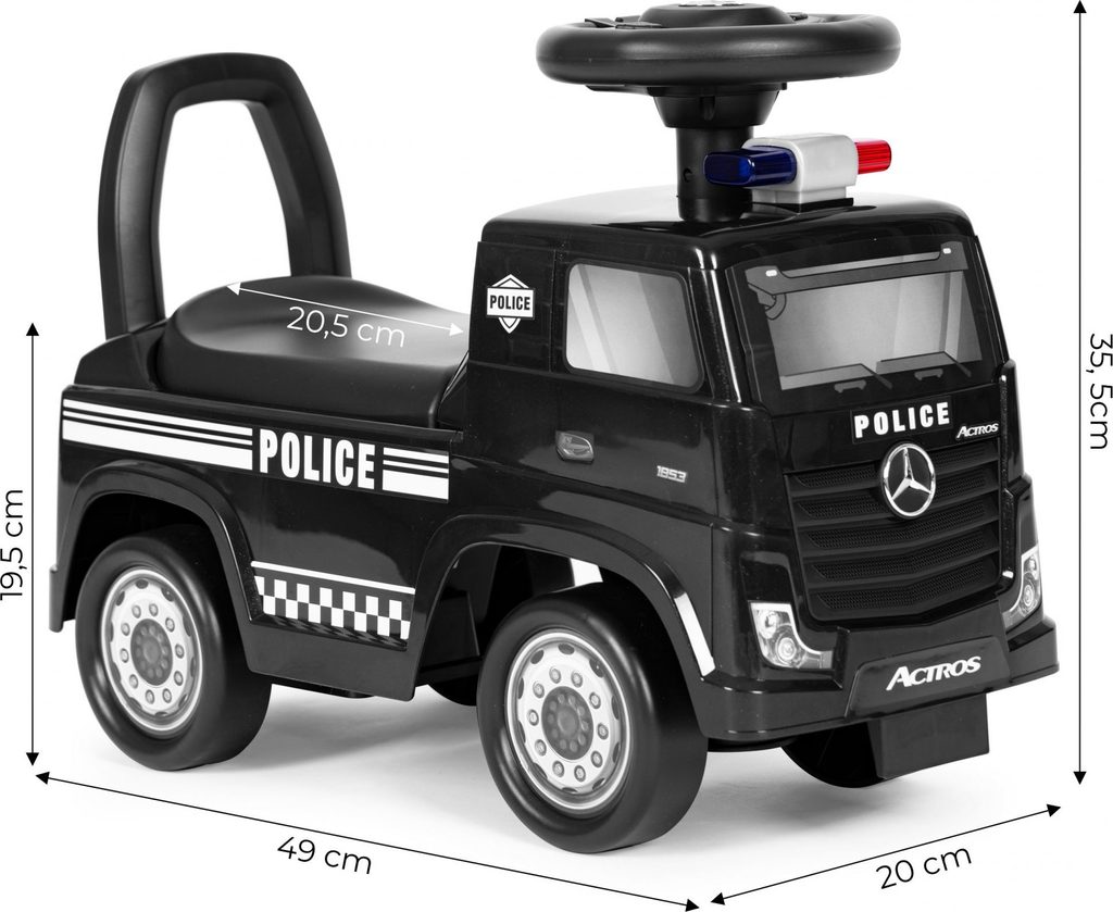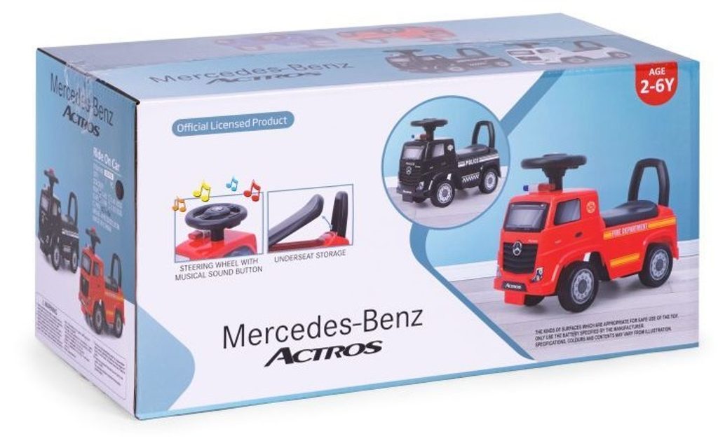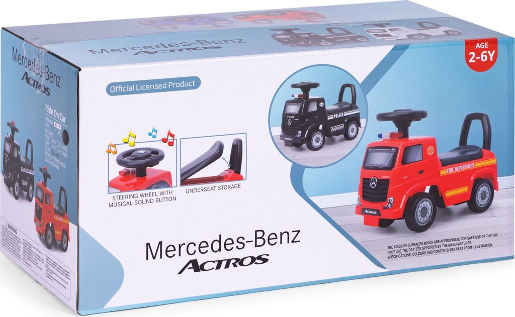 Dětské odrážedlo Mercedes Actros v provedení požárního vozu je určeno pro ty nejmenší děti. Pod sedátkem je umístěn úložný prostor pro hračky. Je vybaveno tlačítkem, které spouští melodie a klakson. Odrážedlo je vhodné pro děti od 24 měsíců. Tvar hračky pomáhá rozvíjet motorické schopnosti dítěte a navíc se bude cítit jako skutečný řidič.