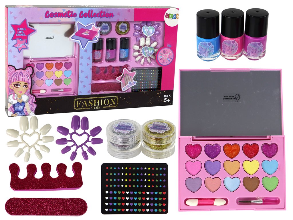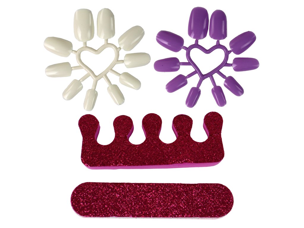 Zde je fantastický set krásy 2 v 1, který rozvine kreativitu vašeho dítěte! Tato sada obsahuje 27 prvků, z toho 10 očních stínů, 5 lesků na rty, 3 laky na nehty (růžový, fialový, modrý), 2 třpytky (zlaté a stříbrné), růžový kosmetický separátor, růžový kosmetický pilník, 20 tipů na nehty (10 fialových a 10 bílých), 2 aplikátory očních stínů a nálepky na zdobení nehtů.