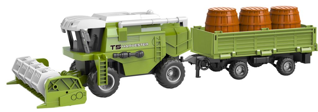 Kombajn T5 Farm s vlečkou a dálkovým ovládáním 2,4GHz je dokonalou imitací skutečného kombajnu. Umožnuje jízdu dopředu a dozadu, zatáčí doprava a doleva. Během jízdy blikyjí světýlka. Součástí balení je dálkový ovladač který je napájen bateriemi, které nejsou součástí balení. Samotný kombajn je napájen akumulátorem, který se nabíjí přiloženou USB nabíječkou. Kombajn je vyroben z plastu a má certifikaci CE.