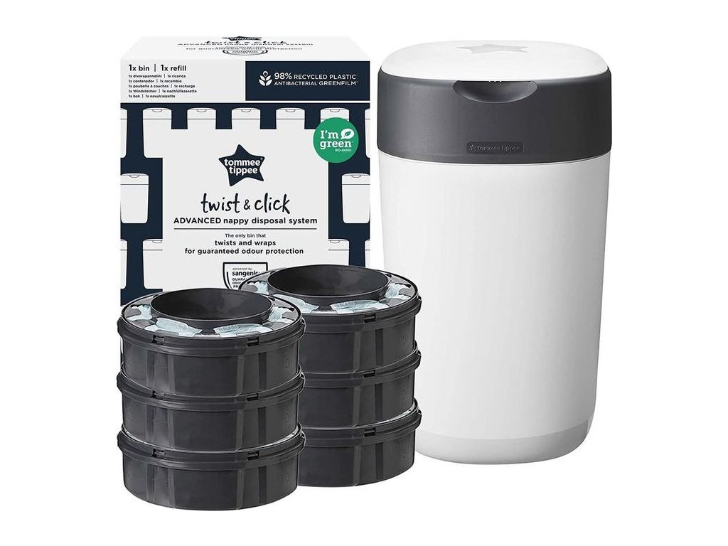 Integrovaný tamper zatlačí plenku hluboko do kbelíku, takže vaše ruce zůstanou čisté. Každá doplňovací kazeta obsahuje dostatek antibakteriální fólie na celý měsíc používání plen v závislosti na velikosti a počtu použitých plen. Navzdory své malé velikosti pojme nádoba na plenky Twist & Click až 28 plen a umožní vám vyhnout se častým výletům do odpadkového koše. Antibakteriální ochranu poskytuje pouze fólie, nikoli ostatní složky tohoto produktu. Kvůli ochraně životního prostředí jsou obal na plenky Twist & Click a vkládací kazety vyrobeny z 98 % z recyklovaného plastu. Vícevrstvá antibakteriální zelená fólie je biologického původu a je vyrobena z trvale udržitelné cukrové třtiny. Systém likvidace plen Twist & Click je kompatibilní pouze s příslušnými náhradními vložkami od Tommee Tippee. Doplňovací kazety Sangenic TEC & Simple e Sangenic nejsou pro tento koš na pleny vhodné.