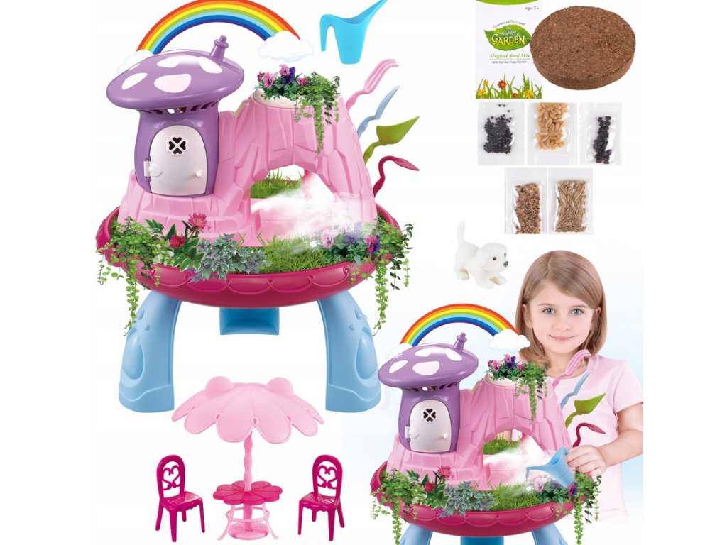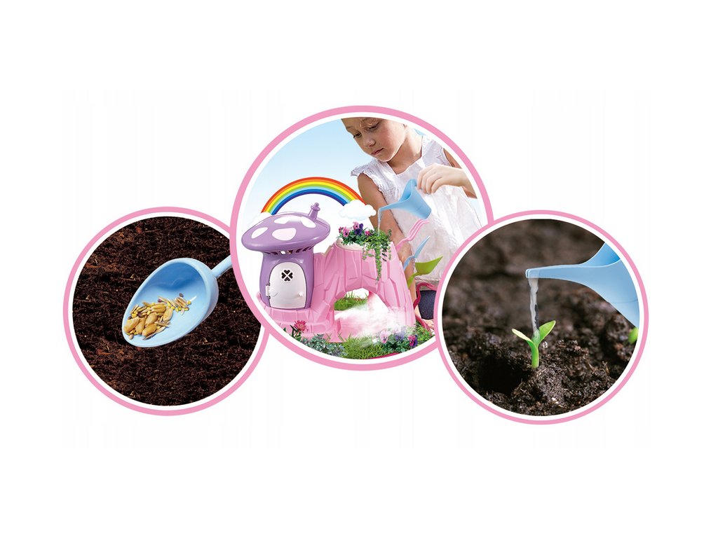 Vytvořte si zahrádku na stole se skálou, uprostřed duhy a houbové chýše Součástí sady je mini konev, hrábě, lopatka, motyčka.
