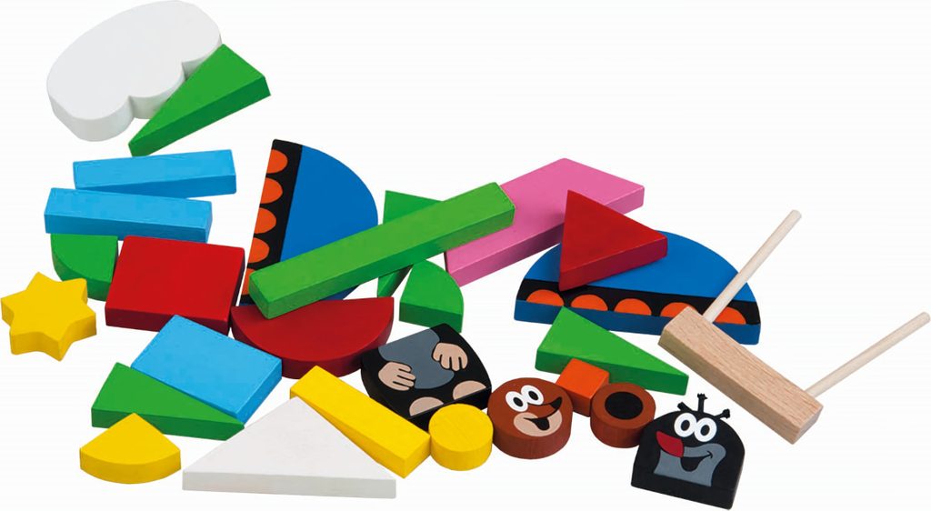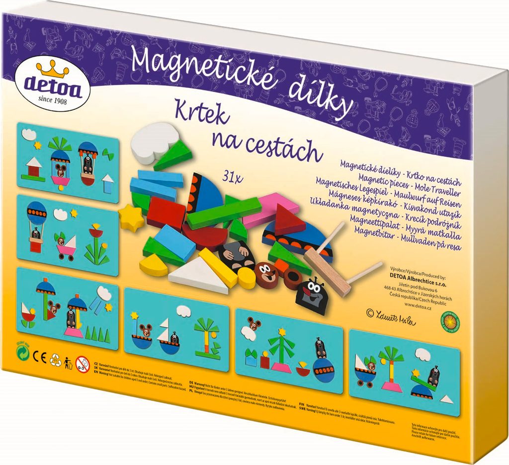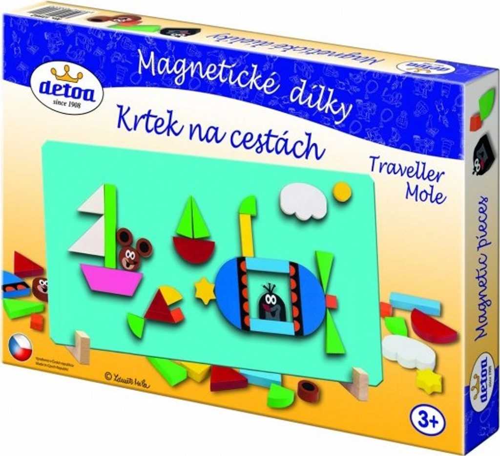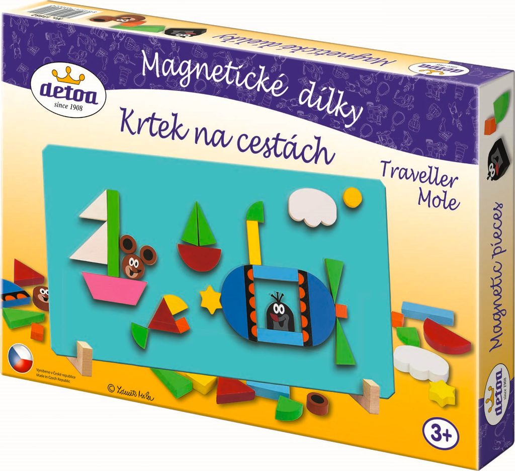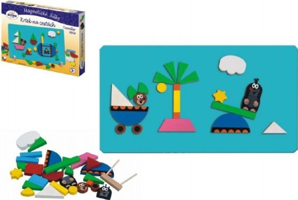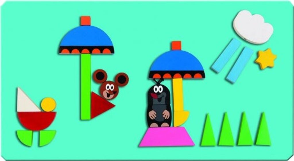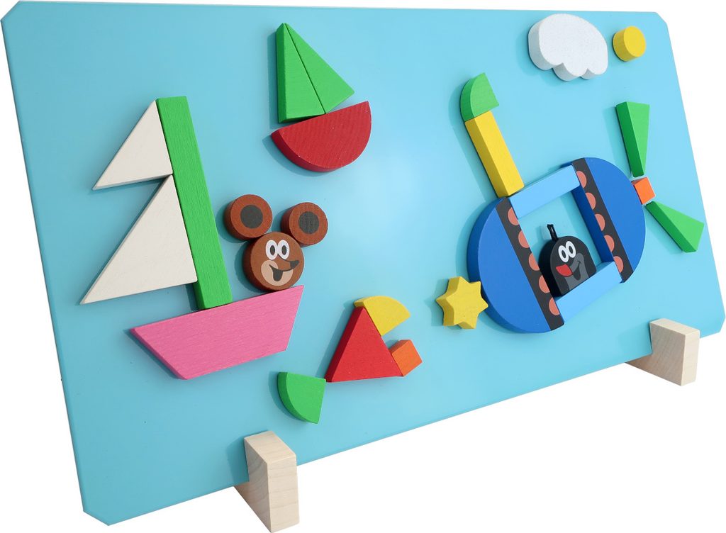Na kovovou tabulku si děti mohou skládat magnetické dílky a sestavit tak nepřeberné množství obrázků s motivem Krtečka a jeho kamarádky Myšky. Sestavený obrázek si díky podstavci mohou vystavit.