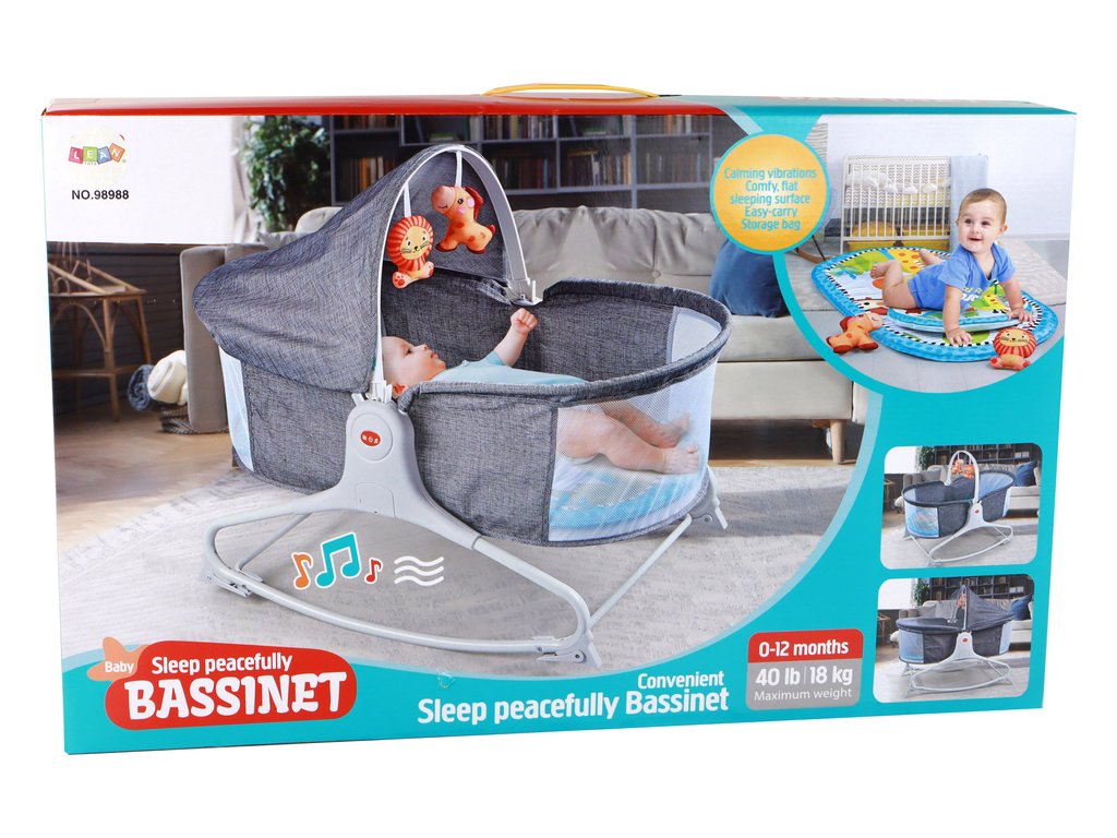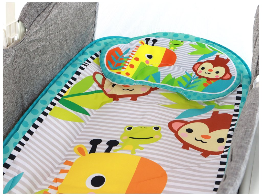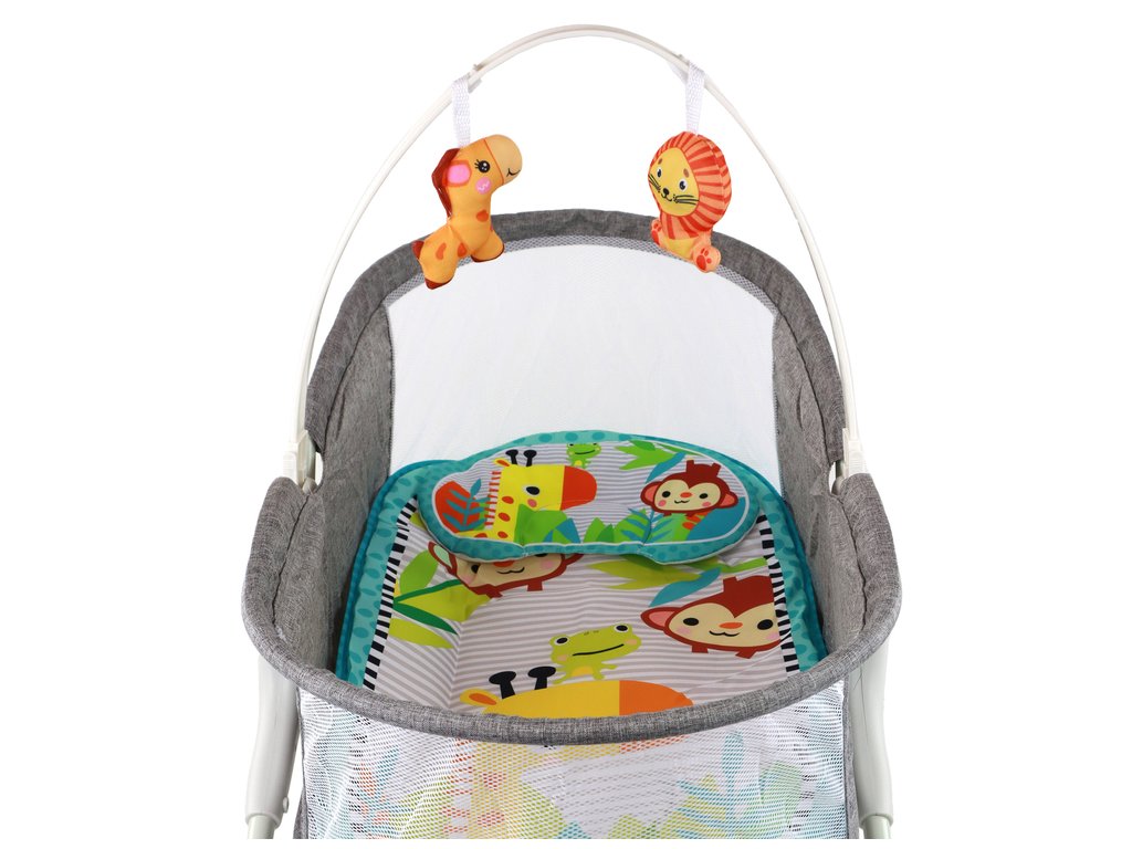 Lehátko má rozměry 85 cm x 70 cm x 50 cm, díky čemuž je ideální pro různé aktivity. Sada obsahuje odnímatelnou hrazdičku s roztomilými hračkami z kvalitního materiálu, jako je lvíček a žirafka, které úžasně stimulují smysly miminka. Kolébka má také zábavná zvířátka, která se objevují na materiálu šedého rockeru a poskytují zábavu pro dítě.