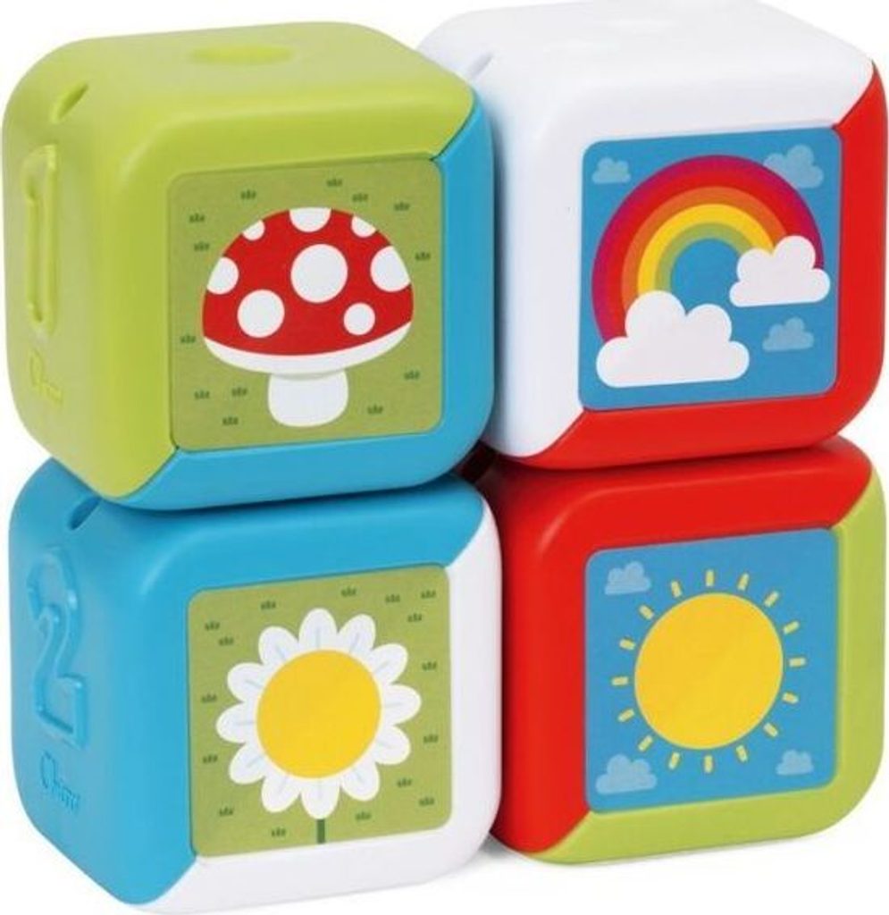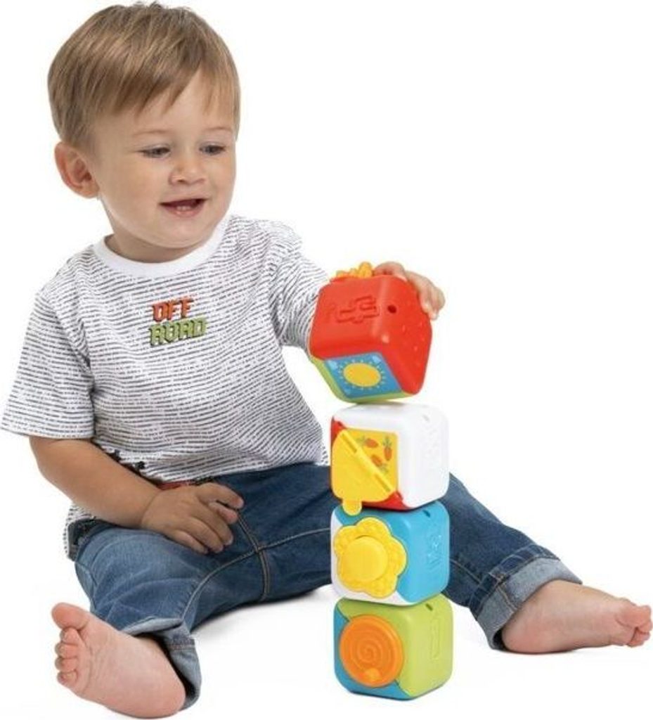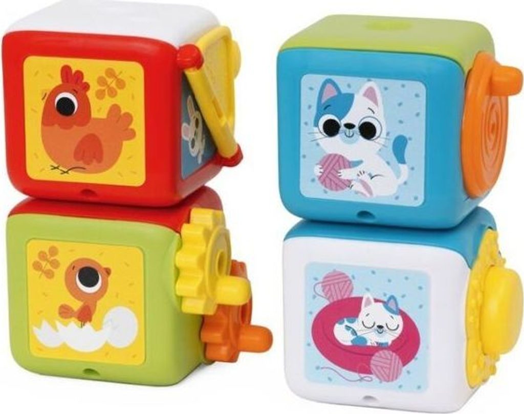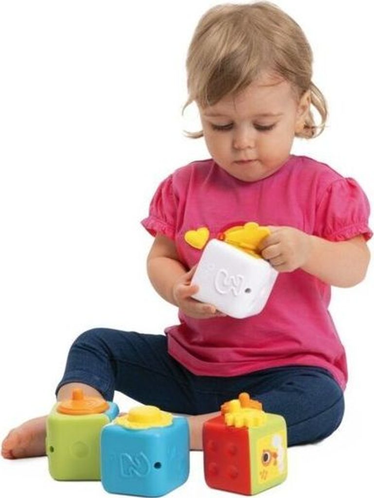 Hračka roste s dítětem a provází dítě různými fázemi jeho vývoje: - 10-18M: dítě náhodně skládá kostky a objevuje na kostkách manuální činnosti - 18-36M: dítě najde správnou dvojici spojením obrázků: kuřátko - kuře, kotě - kočka, slunce - duha a houba - květina a seřadí kostky do správného číselného pořadí - kostky pomáhají vašemu dítěti rozvíjet jemné motorické dovednosti, koordinaci rukou a logické myšlení - 4 různé manuální činnosti: stiskněte květinu, abyste slyšeli zábavný zvukový efekt, otevřete malé okénko, otočte převody a roztočte kolo - vyvinuto ve spolupráci s ANPE (Národní asociace italských pedagogů).