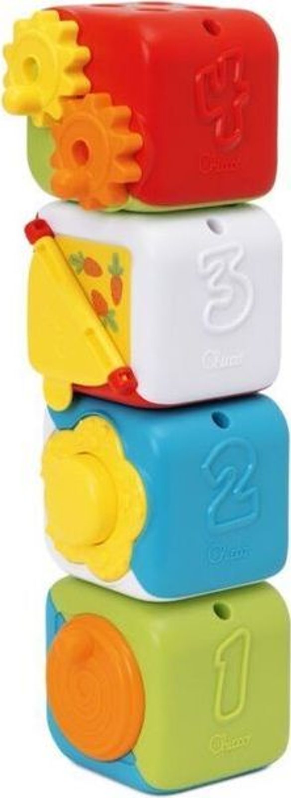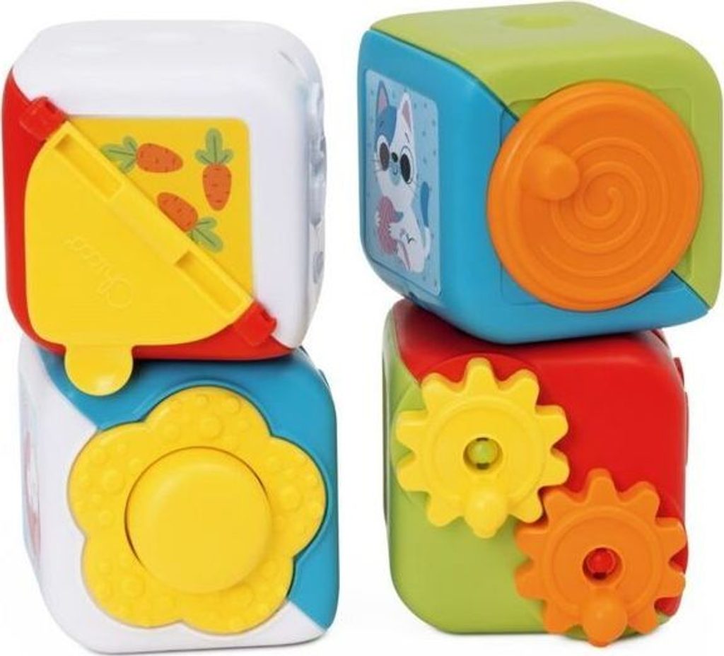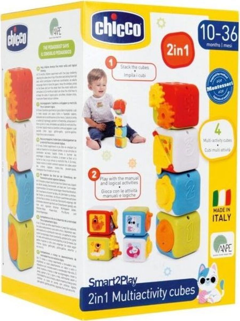 Hračka roste s dítětem a provází dítě různými fázemi jeho vývoje: - 10-18M: dítě náhodně skládá kostky a objevuje na kostkách manuální činnosti - 18-36M: dítě najde správnou dvojici spojením obrázků: kuřátko - kuře, kotě - kočka, slunce - duha a houba - květina a seřadí kostky do správného číselného pořadí - kostky pomáhají vašemu dítěti rozvíjet jemné motorické dovednosti, koordinaci rukou a logické myšlení - 4 různé manuální činnosti: stiskněte květinu, abyste slyšeli zábavný zvukový efekt, otevřete malé okénko, otočte převody a roztočte kolo - vyvinuto ve spolupráci s ANPE (Národní asociace italských pedagogů).
