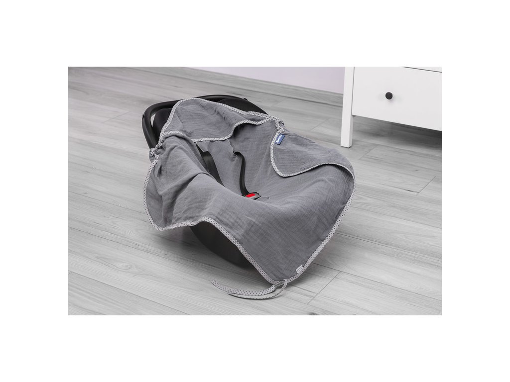 Mušelínová zavinovačka chrání před sluncem, větrem a hmyzem. Díky své lehkosti a prodyšnosti zabraňuje přehřátí dítěte. Dá se použít i jako přikrývka. Látka příjemná na dotek zajistí vašemu dítěti pohodlí na cestách. Vyrobeno z 100% bavlny. Má otvory pro 3-bodové pásy.