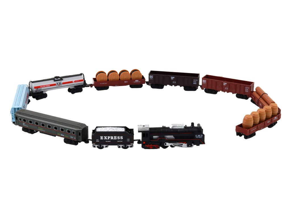 Čím tento model vyniká? Bateriové napájení , bez nutnosti použití napájecího zdroje, což zaručuje bezpečné používání. Velké množství příslušenství - kromě lokomotivy a vagónu na uhlí je v soupravě až 8 vagónů - osobní, nákladní, plněné kládami dřeva, bubny s navinutým lanem, sudy a cisterny. Další výhodou prezentovaného vlaku jsou realistické zvuky jedoucího vlaku, aktivované během hry. Celá sestava dosahuje impozantní délky 150 cm , přičemž sestava kolejí má po sestavení rozměry 122 cm x 68 cm. Skládá se ze 2 pohyblivých výhybek a 17 kolejí.