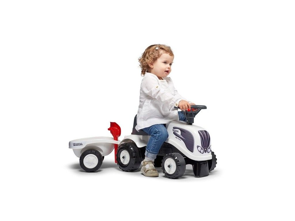 Odstrkovadlo – traktor Valtra s volantem a valníkem. Součástí valníku je lopatka a hrabičky. V balení jsou dvě sady samolepek na přední masku, můžete si vybrat polepky dle vlastní nálady. Vybeno ve Francii z vysoce oddoleného a kvalitního plastu. Testováno dle evropských norem na hnotnost 50 kg. Rozměry odrážedla 91×34×37 cm.