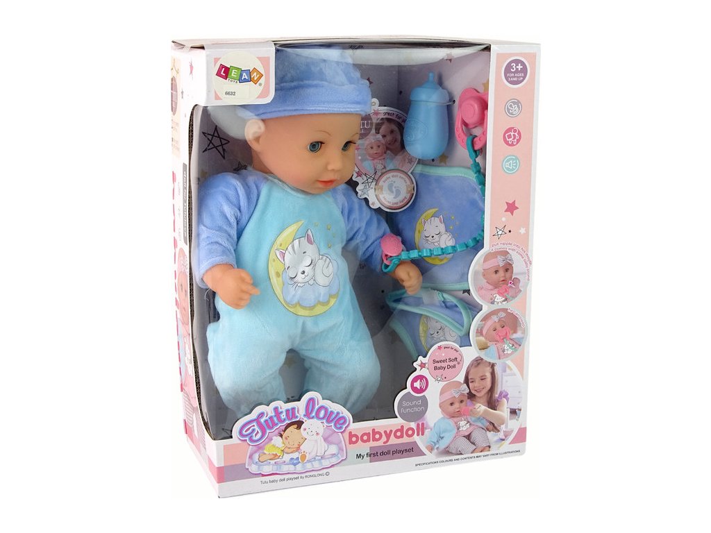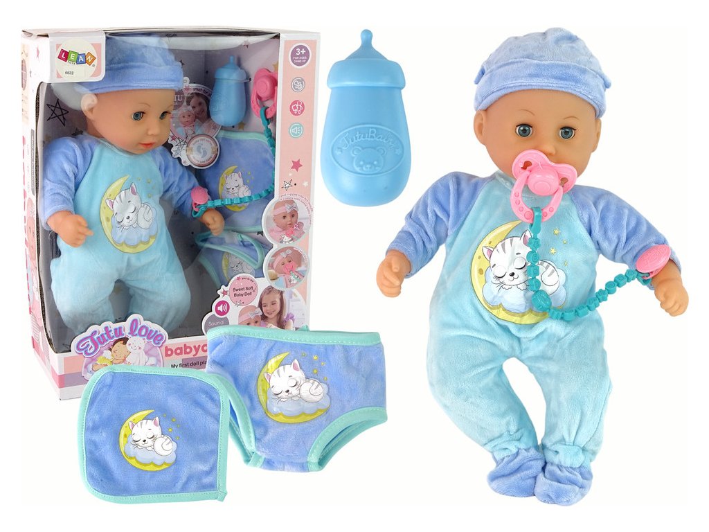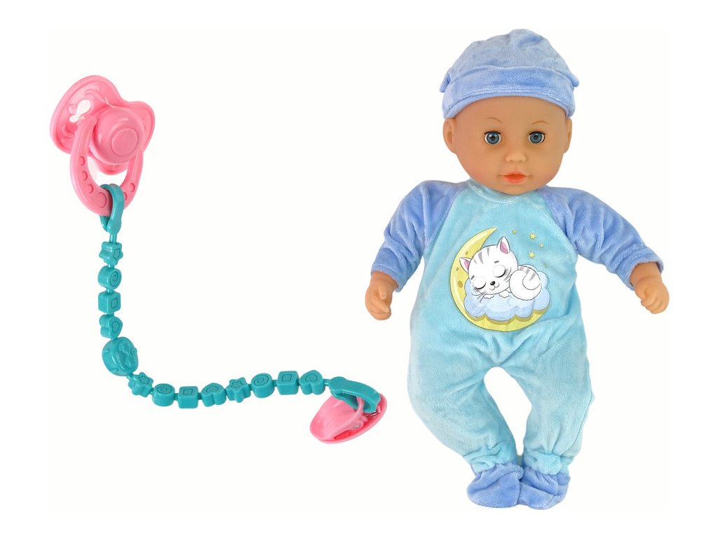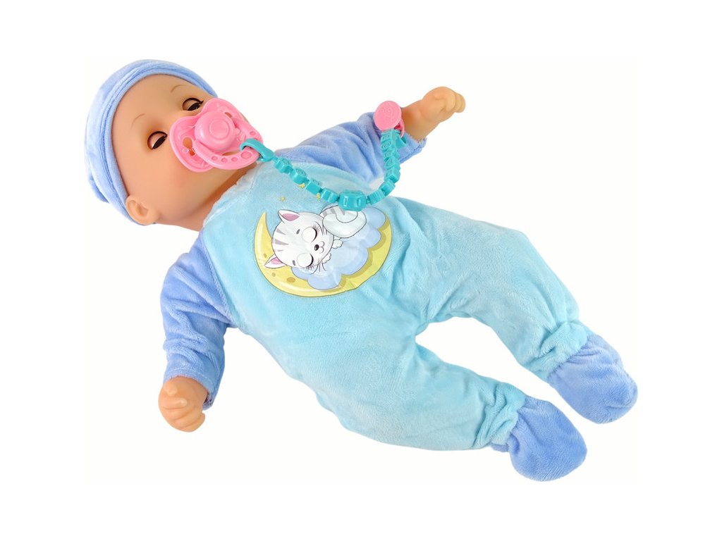 Panenka je oblečená v krásném modrém pyžamku se spící kočičkou uprostřed. Součástí je dudlík a modrá láhev na pití. Doplňky oblečení jsou bryndáček a kalhotky s koťátkem. Celá sada do sebe perfektně ladí a vypadá přímo rozkošně. Panenka má pohyblivé ruce, nohy a hlavu. Může být umístěna vsedě i vleže. Oblečení je odnímatelné, což vám umožní změnit šatník.