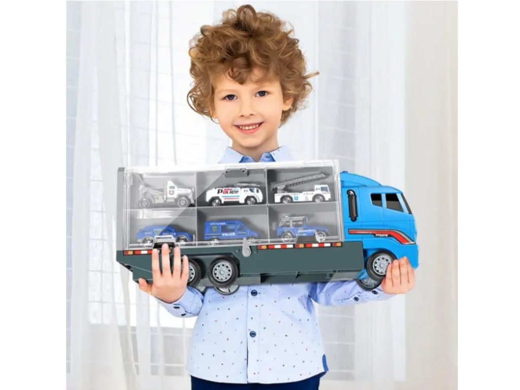 S touto sadou si můžete být jisti, že vaše dítě neztratí ani jedno vozidlo ze své sbírky autíček. Přívěs je oboustranný, vybavený celkem 12 místy, kam lze auta uložit, a díky praktickému madlu je přenášení celé sady snadné.