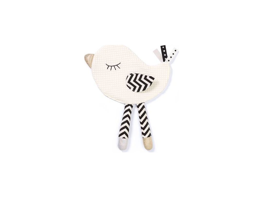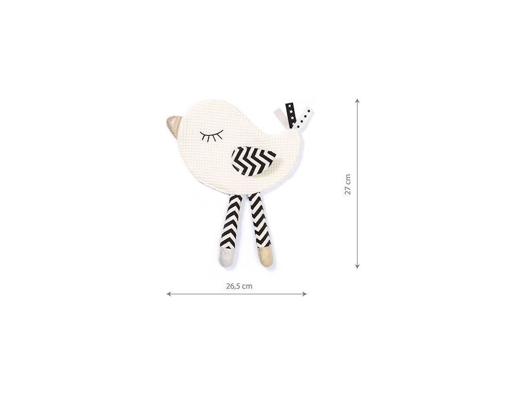 Přítulníček ve tvaru ptáčka má dvě funkce: smyslovou hračku a plyšovou hračku. Vhodné pro děti od prvních dnů života. Poskytuje různé podněty. Stimuluje zrak, sluch a hmat. Ptáček je vyroben z bavlny. Jeho náplň vydává příjemný šustivý zvuk. Je to zajímavé a zvyšuje to pocit bezpečí. Dlouhé nohy, šustící křídla a lesklý zobák vybízejí k tréninku úchopu. Různé textury stimulují rozvoj jemné motoriky a kontrastní barvy přitahují pohled. Šustění je součástí kolekce Blink&Smile.