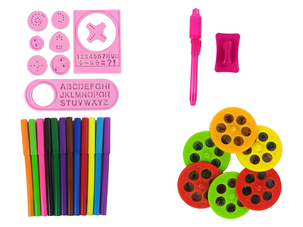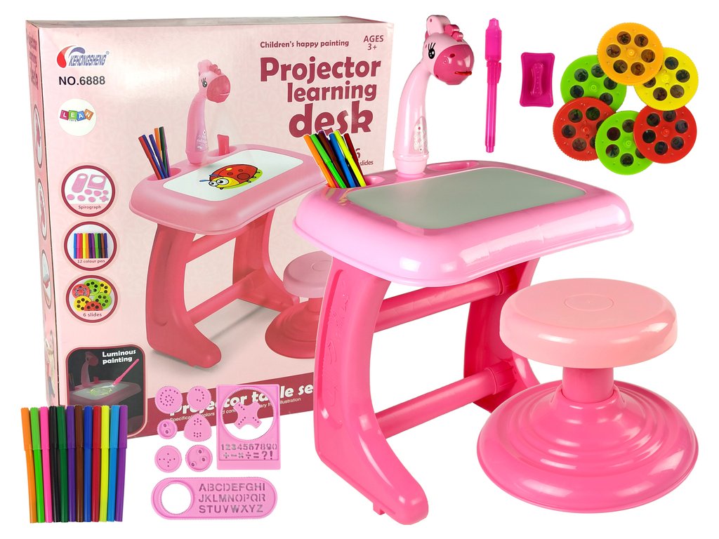 Součástí setu je i malý taburet, se kterým se vašemu dítěti bude u stolu pohodlně sedět. Sedák i stolek jsou v růžové barvě, bude perfektním doplňkem výzdoby dětského pokoje. Na desce stolu jsou dvě malé šuplíky, do kterých schováte fixy v celé škále barev, jsou vždy na dosah. Projektor umístěný uprostřed stolu připomíná přátelskou žirafu. Zobrazuje různé obrázky se zvířaty a postavami, které lze zkopírovat na papír. Šablony v sadě naučí vaše dítě vhodné názvy geometrických obrazců a psaní písmen.