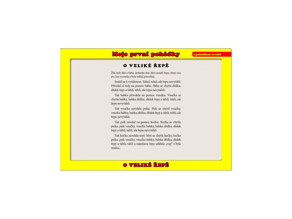 Deskové puzzle O veliké řepě je perfektním spojením pohádky a stavění puzzle, které děti milují. Pod sestaveným obrázkem s motivem tradiční české pohádky ji najdete psanou.Doplňkové parametry