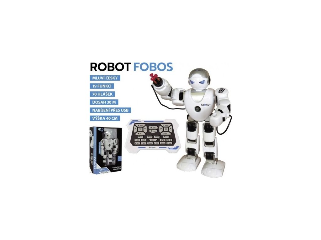 Robot FOBOS - vesmírný kamarád a ochránce, který mluví česky, ovládá robojazyk, střílí, tančí a hraje. Lze ho ovládat pomocí infračerveného dálkového ovladače, dosah je až 30 m. Po spuštění robota se jeho oči rozsvítí, uslyšíte kosmické zvuky a poté začne česky mluvit. Fobos hýbe pažemi, chodí pohybem nohou - plynule se posouvá i otáčí. S FOBOSEM se můžete stát programátorem. Pomocí funkcí na ovladači mu navolíte různé kroky a bude Vám dělat společnost i bez ovladače. Zapamatuje si až 50 příkazů. FOBOS je i skvělý bojovník, k dispozici má pět střel a žádný nepřítel mu neuteče. Velikou výhodou je dobíjení přes USB kabel. Robot je připraven plnit příkazy po 3 hodinách nabíjení. Robot má 19 funkcí, umí 70 hlášek.Doplňkové parametry