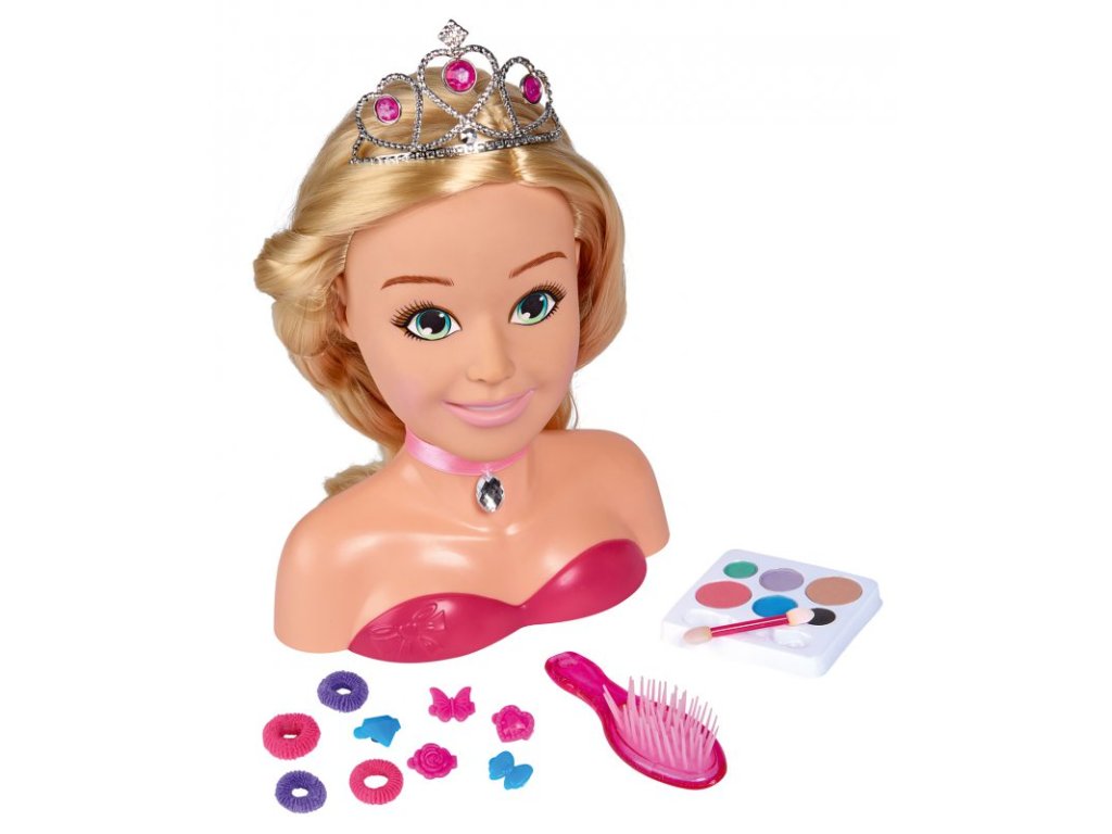 Panenka Princess Head pro vlasový styling a make-up 5560177. Nyní si každá dívka může splnit svůj sen o vlastním kosmetickém salonu! Zde je úžasná sada pro čištění, styling a make-up. Panenka má dlouhé blond vlásky, které se skvěle hodí pro dětský styling. Dají se česat, zaplétat atd. Jaký styl zvolíte: sportovní - dva copánky, glam s oslnivým drdolem nebo třeba městský styl s jemným zapnutím? Sada dále obsahuje korunku se třemi růžovými drahokamy, kartáč na vlasy a paletku s barevnými stíny. Nechybí ani gumičky a sponky, kterými lze vlasy ozdobit. Barvy a dekorace se mohou lišit.
