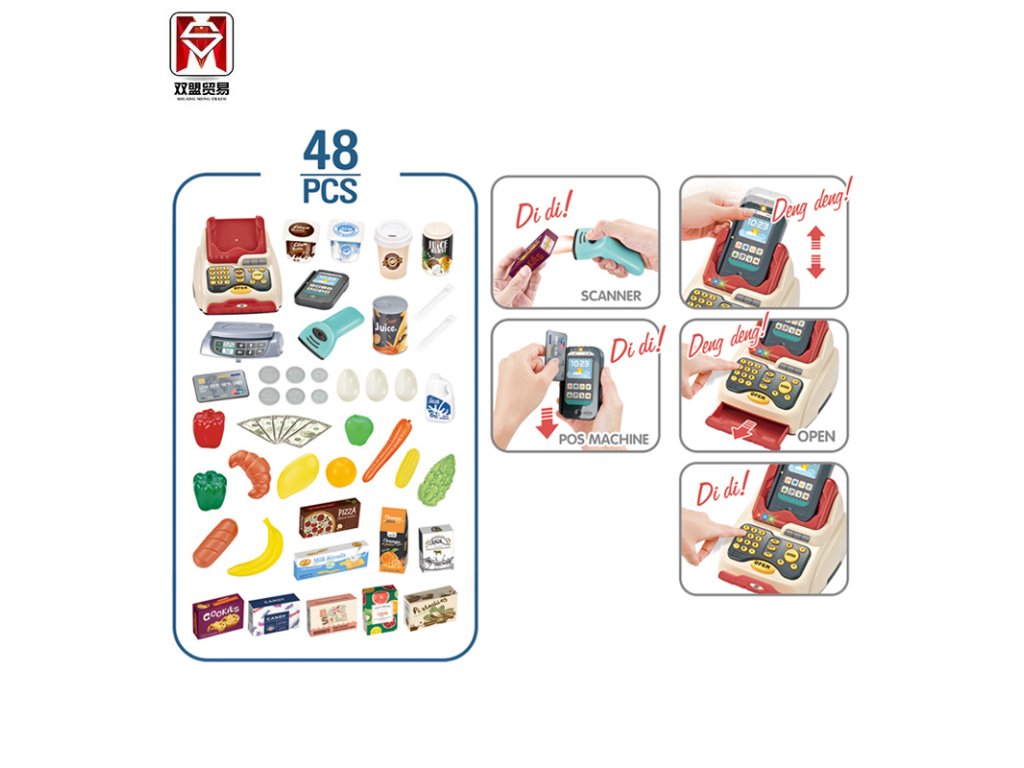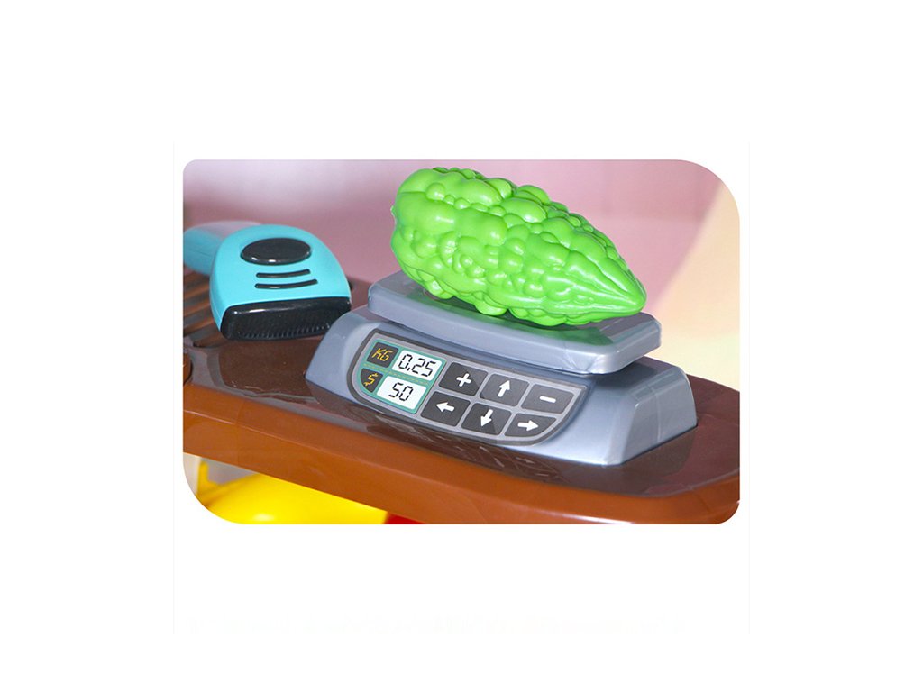 Sada navíc obsahuje skener, který se po stisknutí rozsvítí červeně jako laser a vydává charakteristický zvuk jako ve skutečném obchodě! Skvělá zábava! Sada také pomůže vašemu dítěti seznámit se s pojmy cena, hmotnost a čísla.