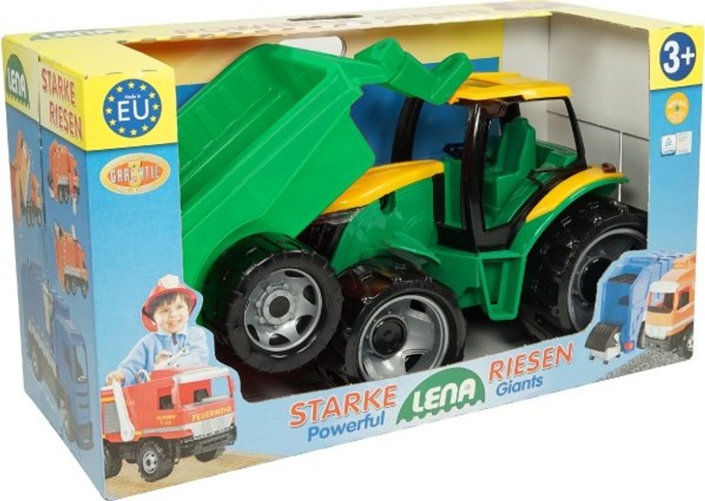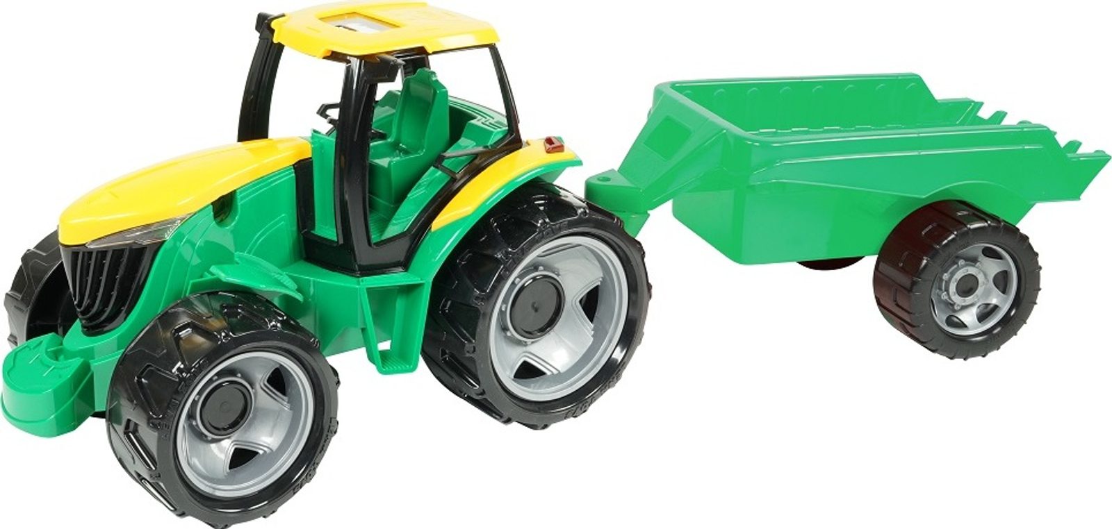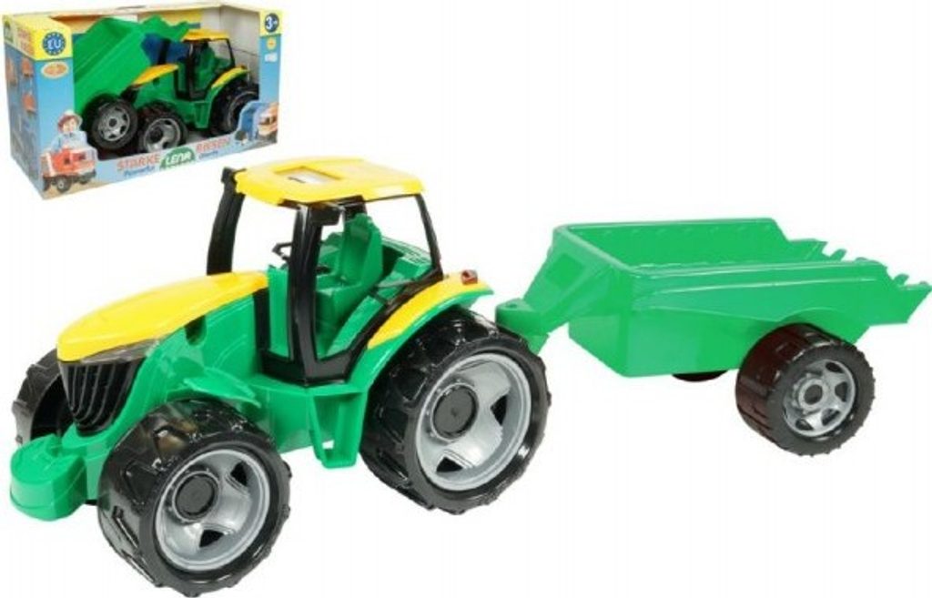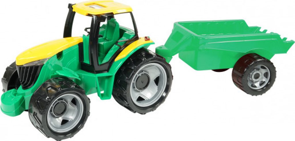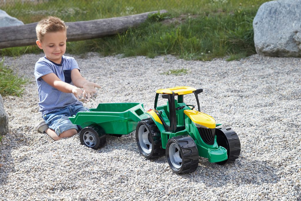 Plastový traktor s vozíkem, který je připraven na hrátky na písku.