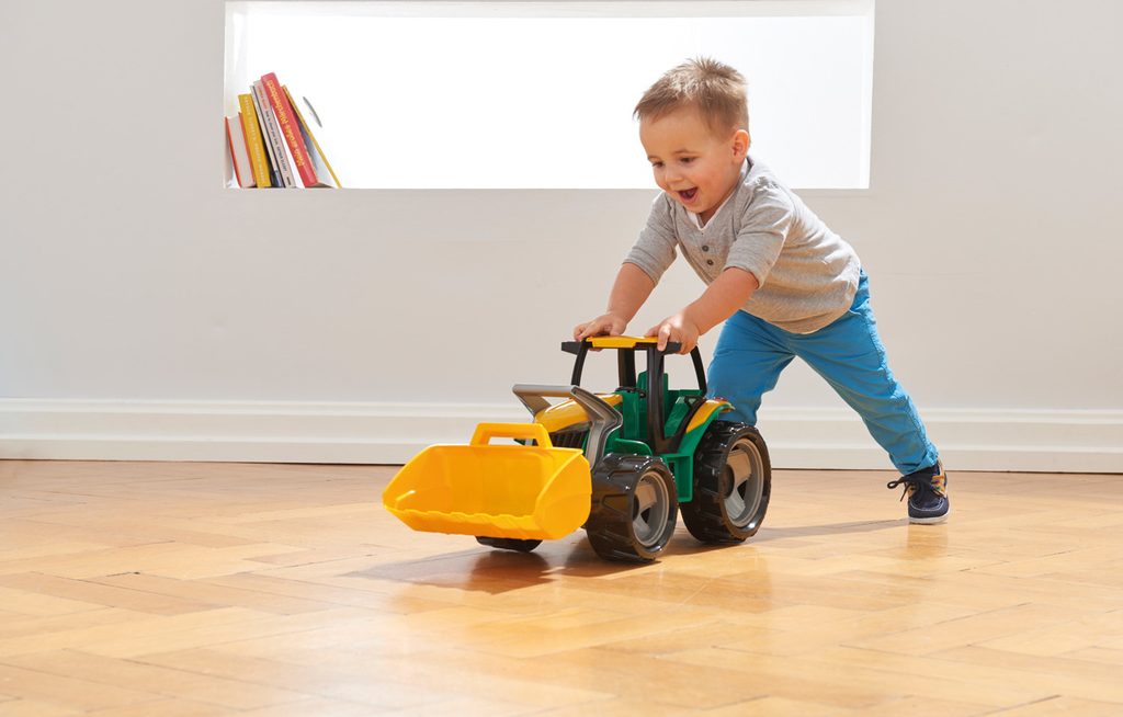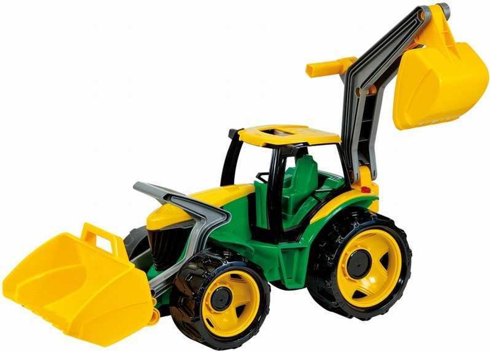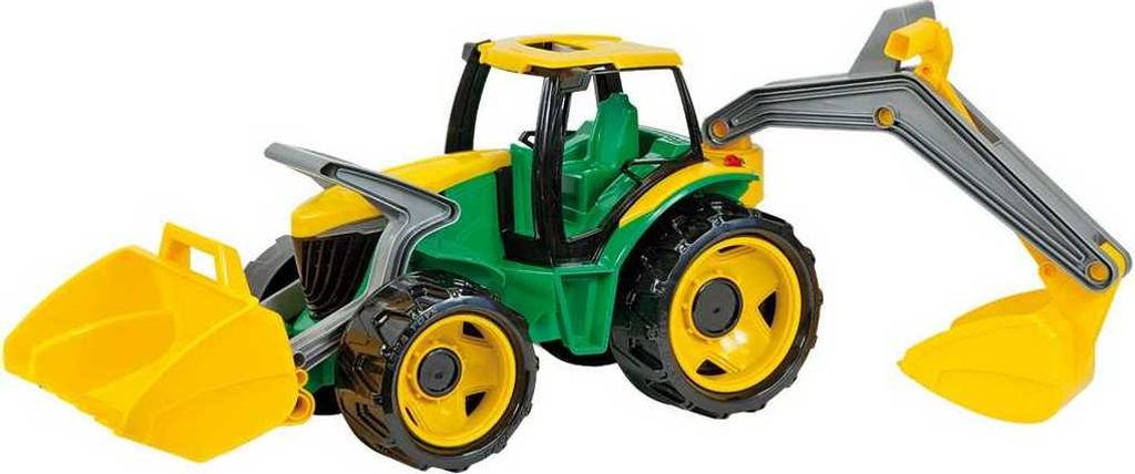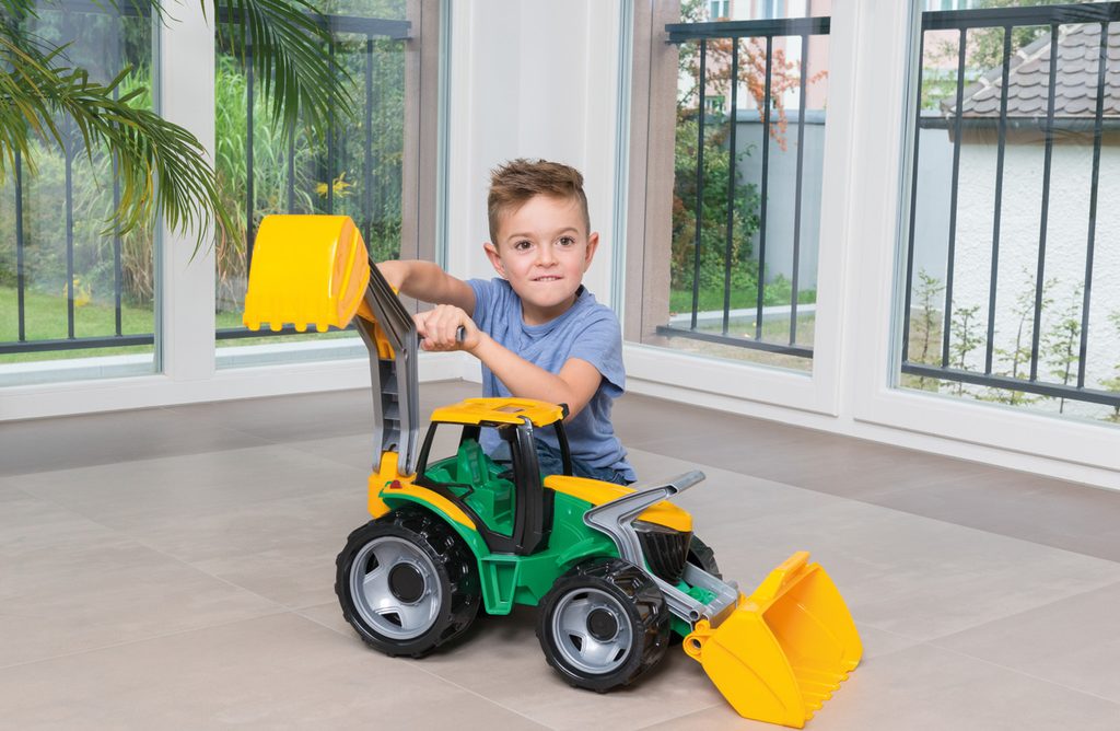 Zeleno-žlutý traktor se lžící a bagrem, který je připravený na písek.