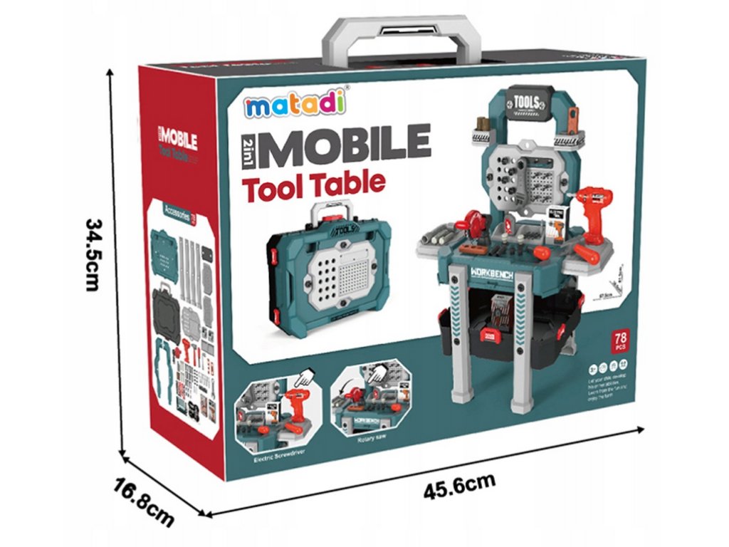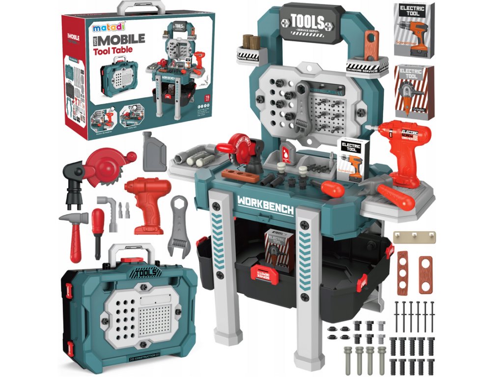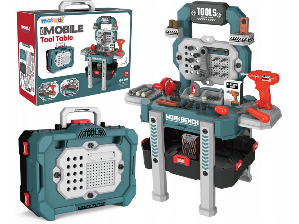 Tato hračka plní dvě funkce - dílnu a kufr. Dítě si ji může vzít k prarodičům, do školy nebo ke kamarádovi.