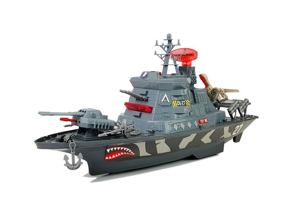 Vojenskou loď doporučujeme těm, kteří si rádi hrají na vojenské akce a zároveň jsou nadšení pro lodě. Sada rozvine představivost a kreativitu a umožní mladým vojákům vytvářet bitevní plány. Loď má čtyři tlačítka, z nichž každé vydává zvukové signály a jinou kombinaci světelných efektů. Po stisknutí jednoho z nich se radar otočí, rozsvítí se a navíc se přidají zvuky. Můžete slyšet zvuky moře, výstřely, alarmy a slova kapitána v angličtině. To se musíte přesvědčit sami. Tato zajímavá hračka vás zavede do světa námořních vojenských sil. Pohyblivá děla a bojová děla na vrcholu lodi udělají zábavu ještě realističtější.